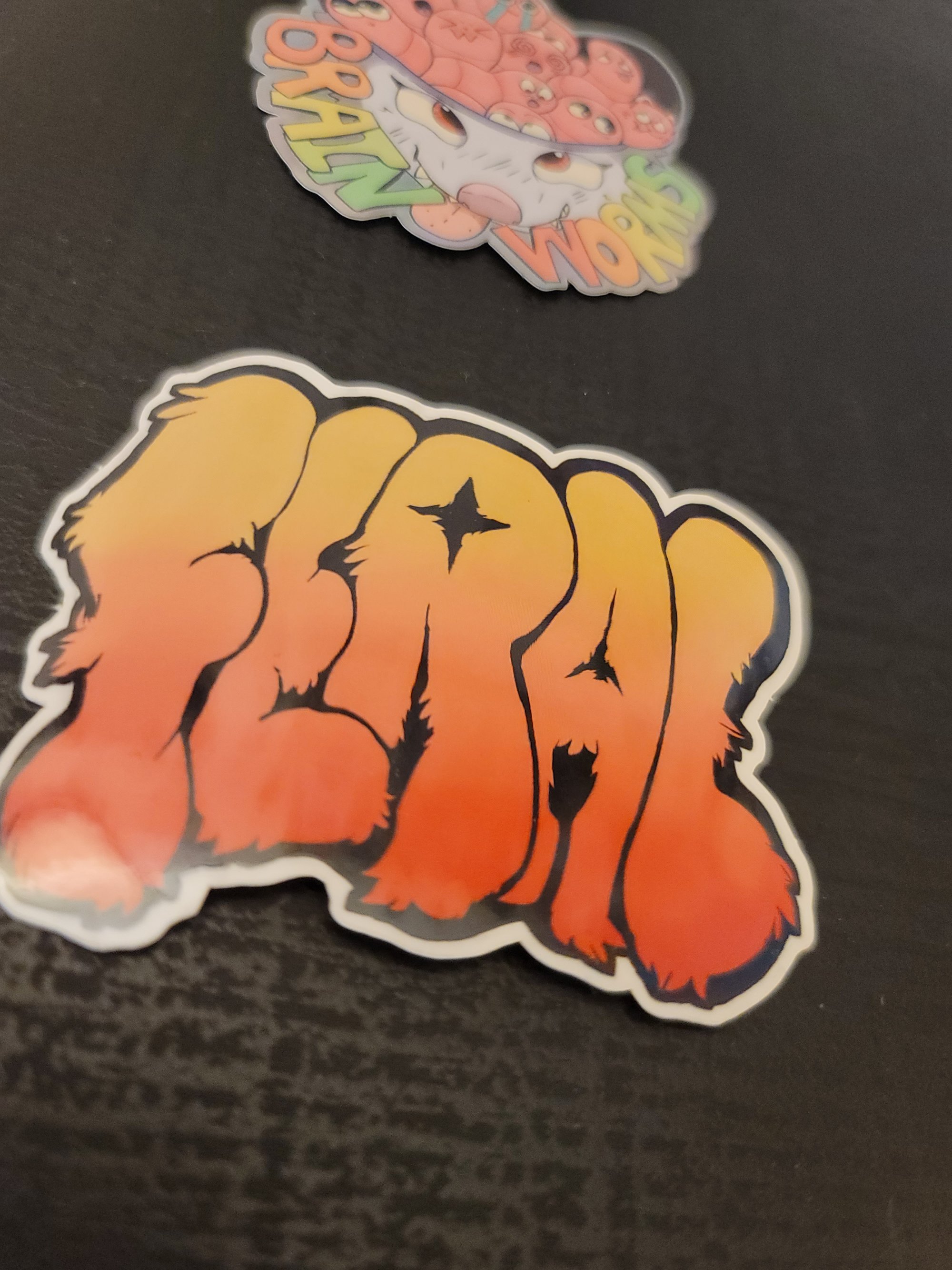 Each sticker is roughly 3 inches large, feral is transparent and blends into any surface, brain worms is holographic. Each is die cut and can stick to most surfaces!